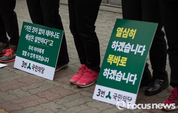 (서울=포커스뉴스) 총선 선거운동이 공식적으로 시작된 31일 오후 서울 영등포구 여의도백화점 앞에서 선거운동 자원봉사자들이 김종구 국민의당 영등포을 후보 지원 유세를 하고 있다.