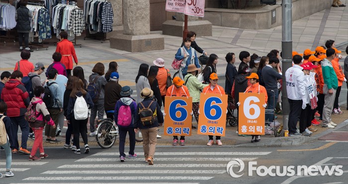 (대구=포커스뉴스) 31일 오후 대구 북구 칠곡네거리에서 새누리당 대구 북구을 양명모 후보 선거운동원과 무소속 대구 북구을 홍의락 후보 선거운동원이 지역주민들에게 한표를 호소 하고 있다.