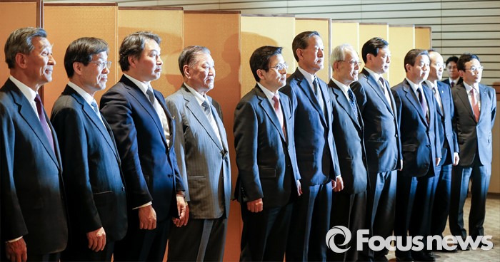 연봉 상위 50명을 그룹별로 보면 삼성그룹 소속이 8명으로 가장 많았고, LG그룹은 7명으로 뒤를 이었다, 이어 현대차, 두산, LS 그룹이 4명씩, CJ와 SK그룹이 3명씩 포함됐다.(서울=포커스뉴스) 황교안 국무총리가 서울 영등포구 전국경제인연합회관에서 열린 '전경련 회장단 초청만찬'에 자리해 회장단과 사진촬영을 하고 있다. 왼쪽부터 박영주 이건산업 회장, 권오준 포스코 회장, 최태원 SK 회장, 정몽구 현대자동차그룹 회장, 황교안 국무총리, 허창수 전국경제인연합회 회장, 이준용 대림산업 회장, 신동빈 롯데그룹 회장, 김윤 삼양홀딩스 회장, 추경호 국무조정실장, 이승철 전국경제인연합회 부회장. 강진형 기자