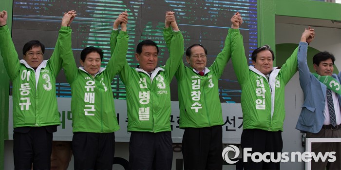 (대전=포커스뉴스) 31일 오후 대전 서대전역광장에서 열린 대전 국민의당 국회의원 후보자 출범식에서 후보자들이 필승을 다짐하고 있다.