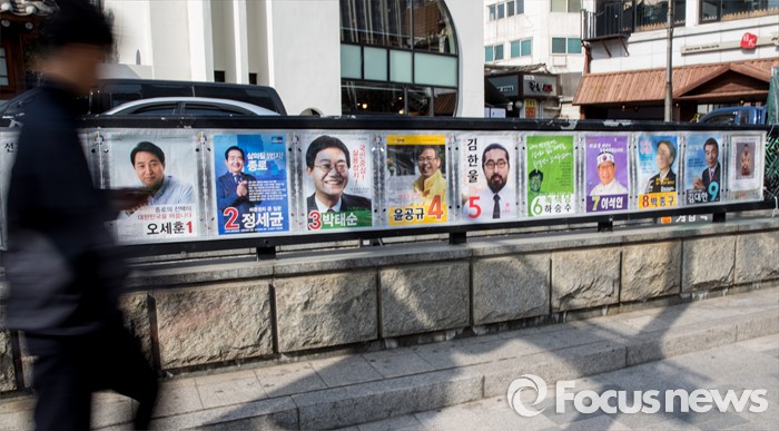 (서울=포커스뉴스) 4·13 총선의 본격적인 선거운동이 시작된 31일 오후 서울 종로구 경복궁역에 부착된 선거벽보 앞을 시민들이 지나가고 있다.