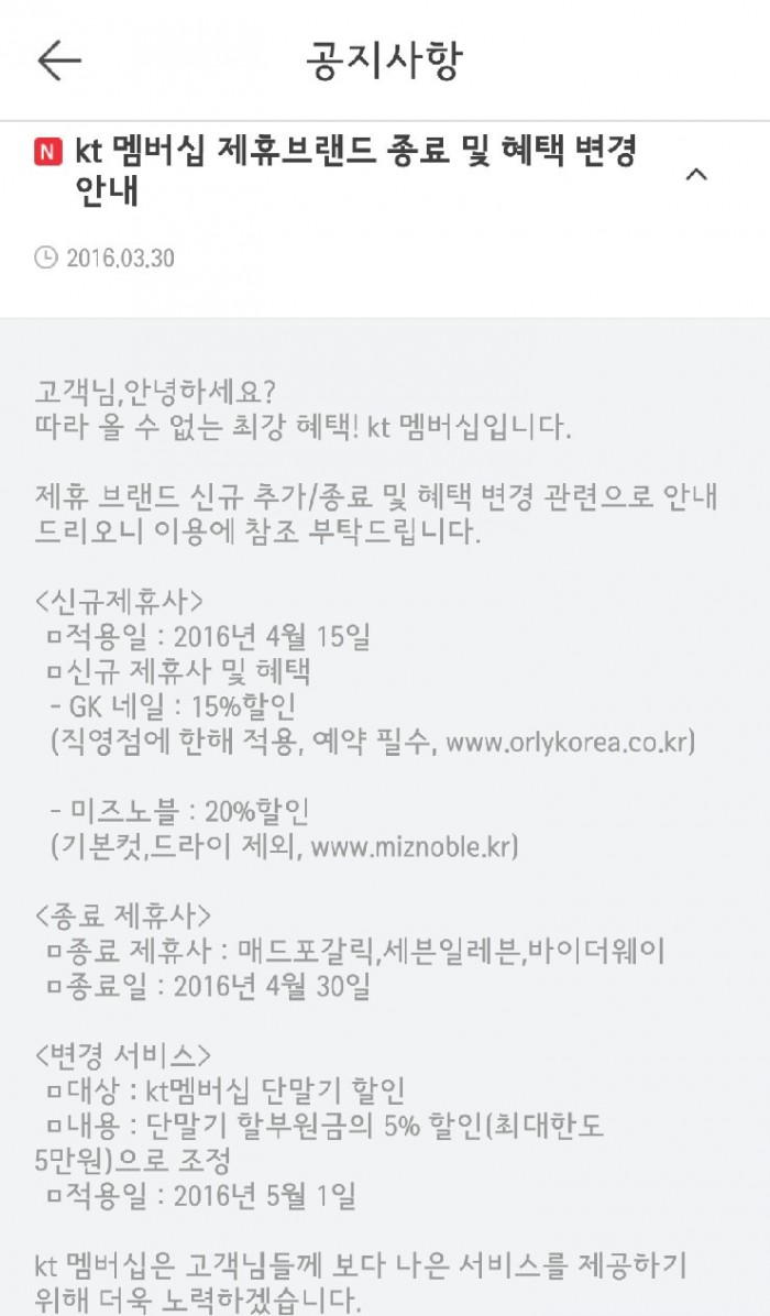 KT는 대신 네일샵과 미용실로 멤버십 혜택을 확대했다. KT고객은 4월15일부터 GK네일에서 15%, 미즈노블에서는 20%할인을 받을 수 있다.