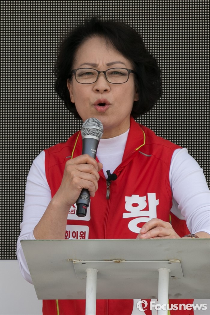 (서울=포커스뉴스) 4.13 총선 공식선거운동이 시작된 31일 오후 서울 용산구 후암시장 앞에서 황춘자 용산 후보가 유세를 하고 있다.