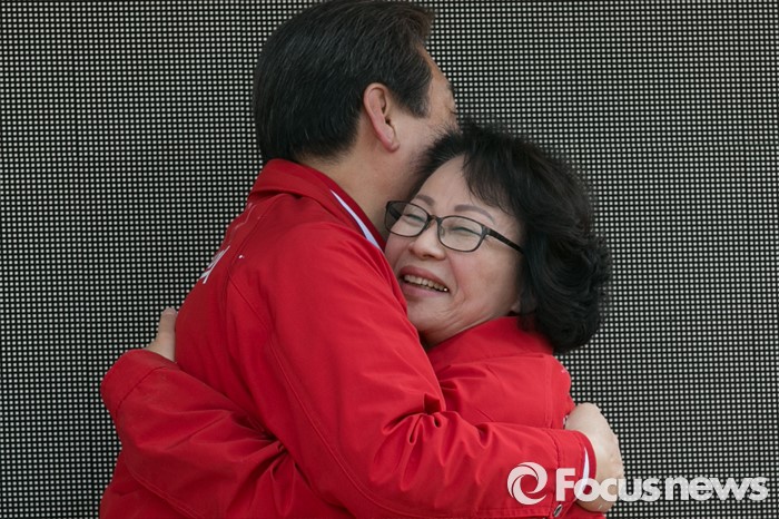(서울=포커스뉴스) 4.13 총선 공식선거운동이 시작된 31일 오후 서울 용산구 후암시장 앞에서 김무성(왼쪽) 새누리당 대표와 황춘자 용산 후보가 유세를 마친 뒤, 포옹하고 있다.