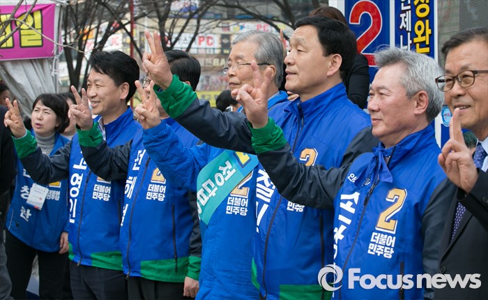 (안산=포커스뉴스) 20대 총선 공식선거 운동이 시작된 31일 오후 경기도 홈플러스 안산고잔점 앞에서 열린 더불어민주당 안산 집중유세에 참석한 김종인 비대위 대표 겸 선대위원장과 후보들이 취재진을 향해 포즈를 취하고 있다. 오른쪽부터 원혜영 경기 부천오정구, 손창완 안산 단원을, 김철민 상록을 후보, 김 대표, 전해철 상록갑, 고영인 단원갑 후보.