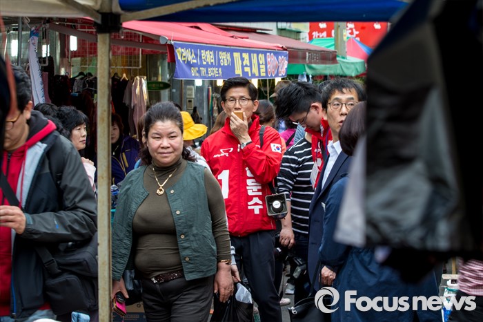 (대구=포커스뉴스) 새누리당 대구 수성구갑 김문수 후보가 31일 오후 대구 수성구 신매시장을 방문해 유권자들에게 한 표를 호소 하고 있다.