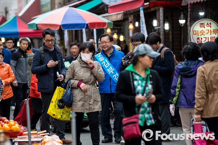 (대구=포커스뉴스) 더불어민주당 대구 수성구갑 김부겸 후보가 31일 오후 대구 수성구 신매시장을 방문해 유권자들에게 한 표를 호소 하고 있다.