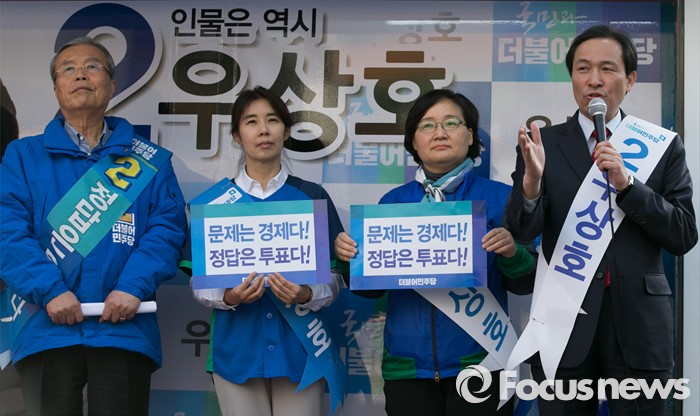 (서울=포커스뉴스) 20대 총선 공식선거 운동이 시작된 31일 오후 서울 신촌 유플렉스 앞에서 우상호(오른쪽 첫번째) 더불어민주당 서대문갑 후보가 지지를 호소하고 있다. 왼쪽 첫번째는 김종인 비대위 대표 겸 선대위원장.