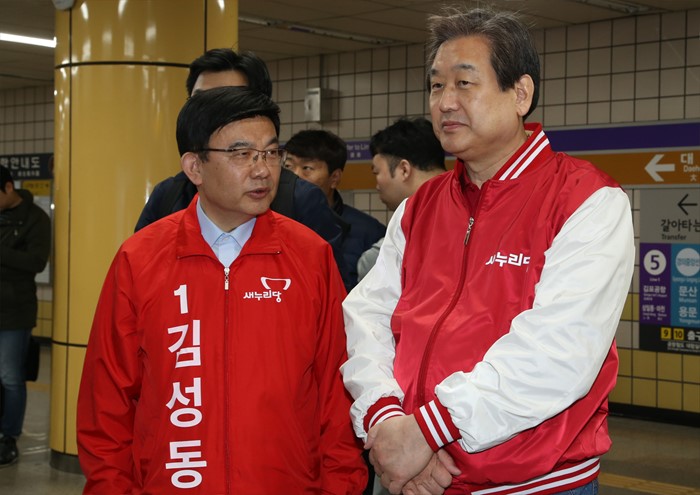 (서울=포커스뉴스) 20대 총선 공식선거 운동이 시작된 31일 오후 지원 유세에 나선 김무성(오른쪽) 새누리당 공동선대위원장이 김성동 마포을 후보와 지하철 6호선을 이용하기 위해 열차를 기다리며 대화하고 있다. <사진제공=새누리당>