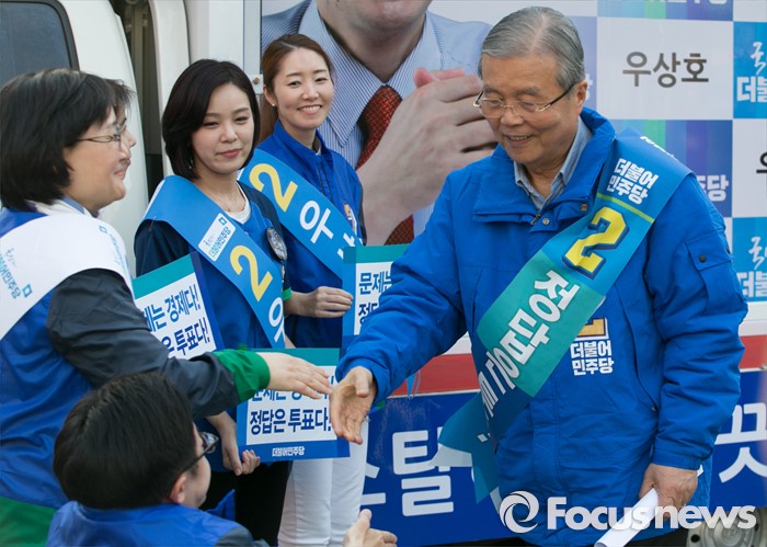 (서울=포커스뉴스) 20대 총선 공식선거 운동이 시작된 31일 오후 서울 신촌 유플렉스 앞에서 김종인 더불어민주당 비대위 대표 겸 선대위원장이 우상호 서대문갑 후보의 지원 유세에 앞서 비례대표 후보들과 인사하고 있다.