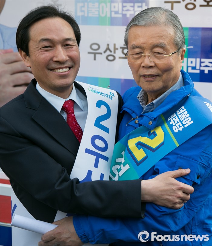 (서울=포커스뉴스) 20대 총선 공식선거 운동이 시작된 31일 오후 서울 신촌 유플렉스 앞에서 김종인(오른쪽) 더불어민주당 비대위 대표 겸 선대위원장이 우상호 서대문갑 후보의 지지를 호소한 뒤 우 후보와 포옹하며 포즈를 취하고 있다.