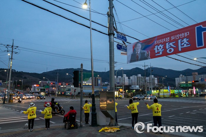 (경산=포커스뉴스) 정의당 경북 경산시 배윤주 후보를 비롯한 선거운동원들이 31일 오후 경북 경산시 중앙병원 네거리에서 유권자들에게 한 표를 호소 하고 있다.