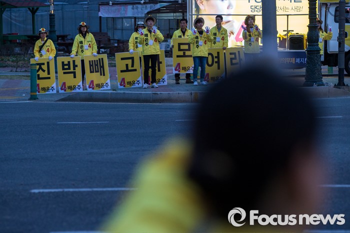 (경산=포커스뉴스) 정의당 경북 경산시 배윤주 후보 선거운동원들이 31일 오후 경북 경산시 중앙병원 네거리에서 유권자들에게 한 표를 호소 하고 있다.