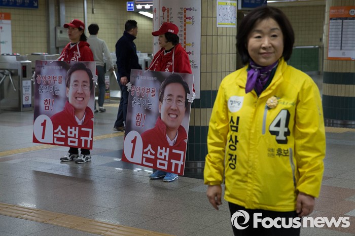 (고양=포커스뉴스) 1일 오전 고양시 덕양구 삼송역에서 심상정 정의당 대표 고양갑 후보가 출근길 선거유세를 하고 있다.