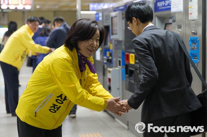 (고양=포커스뉴스) 1일 오전 고양시 덕양구 삼송역에서 심상정 정의당 대표 고양갑 후보가 출근길 선거유세를 하고 있다.