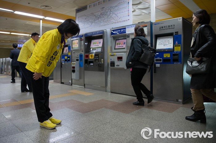(고양=포커스뉴스) 1일 오전 고양시 덕양구 삼송역에서 심상정 정의당 대표 고양갑 후보가 출근길 선거유세를 하고 있다.
