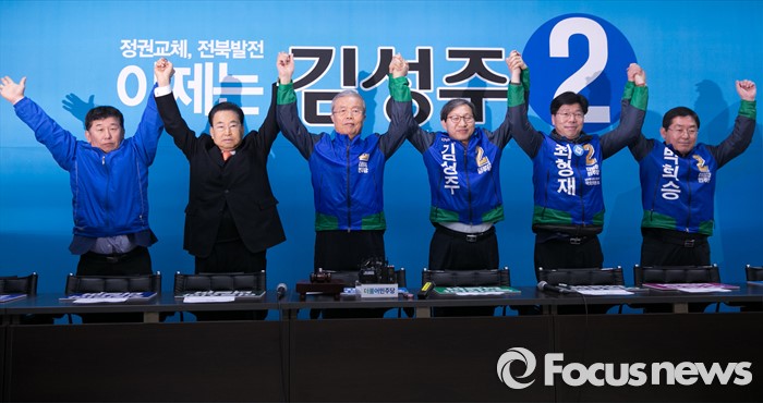 (전주=포커스뉴스) 1일 오전 김성주 더불어민주당 전북 전주병 후보 선거사무소에서 열린 중앙당선거대책위원회의에 참석한 김종인 비대위 대표 겸 선대위원장 등 참석자들이 손을 들어 포즈를 취하고 있다. 왼쪽부터 이석행, 송현섭 부위원장, 김 대표, 김 후보, 최형재 전주을 후보, 박희승 남원·임실·순창 후보.