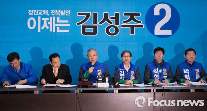 (전주=포커스뉴스) 1일 오전 김성주 더불어민주당 전북 전주병 후보 선거사무소에서 열린 중앙당선거대책위원회의에 참석한 김종인 비대위 대표 겸 선대위원장이 모두발언을 하고 있다. 왼쪽부터 이석행, 송현섭 부위원장, 김 대표, 김 후보, 최형재 전주을 후보, 박희승 남원·임실·순창 후보.