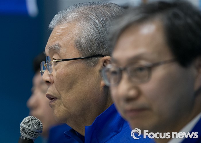 (전주=포커스뉴스) 1일 오전 김성주 더불어민주당 전북 전주병 후보 선거사무소에서 열린 중앙당선거대책위원회의에 참석한 김종인 비대위 대표 겸 선대위원장이 모두발언을 하고 있다.