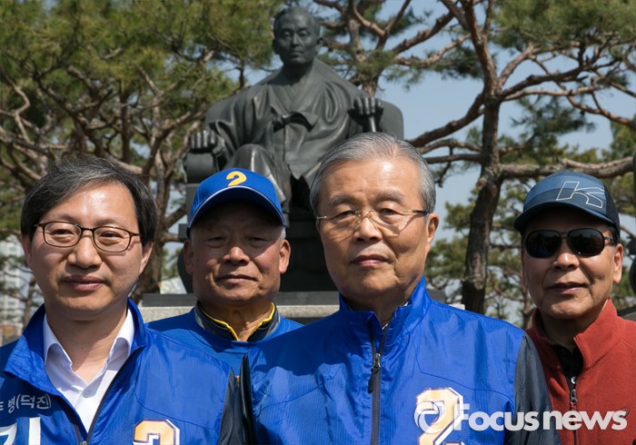 (전주=포커스뉴스) 1일 오전 전북 전주시 덕진공원을 방문한 김종인(오른쪽 두번째) 더불어민주당 비대위 대표 겸 선대위원장과 김성주(왼쪽 첫번째) 전주병 후보가 김 대표의 조부인 가인 김병로 선생 등 '법조 3성' 동상 앞에서 해설사들과 기념촬영을 하고 있다.