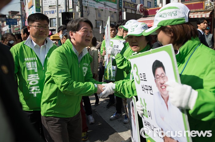(안양=포커스뉴스) 안철수 국민의당 상임공동대표가 1일 오전 안양시 동안구 중앙시장에서 백종주 동안구갑 후보 지원 유세를 하고 있다.