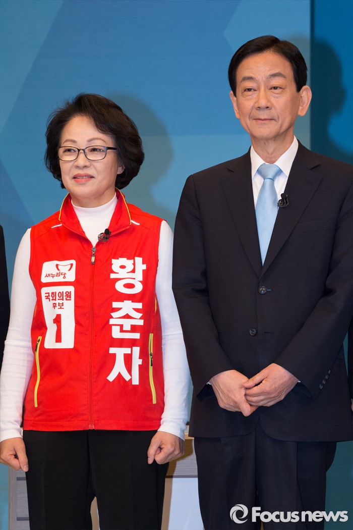 (서울=포커스뉴스) 1일 오전 서울 마포구 서강대 스튜디오에서 제20대 국회의원선거 용산구 후보자 토론회 시작 전 황춘자(왼쪽) 새누리당 후보, 진영 더불어민주당 후보가 포토타임을 갖고 있다.