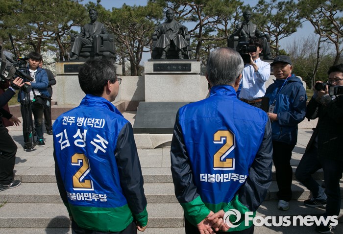 (전주=포커스뉴스) 1일 오전 전북 전주시 덕진공원을 방문한 김종인(오른쪽) 더불어민주당 비대위 대표 겸 선대위원장과 김성주 전주병 후보가 김 대표의 조부인 가인 김병로 선생 등 '법조 3성' 동상을 바라보고 있다.