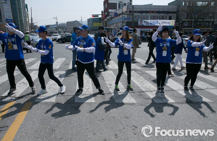 (전주=포커스뉴스) 1일 오전 전북 전주 모래내시장 입구에서 열린 더불어민주당 최형재 전주을, 김성주 전주병 후보 유세에 참여한 선거운동원들이 횡단보도 신호에 맞춰 지지를 호소하고 있다.