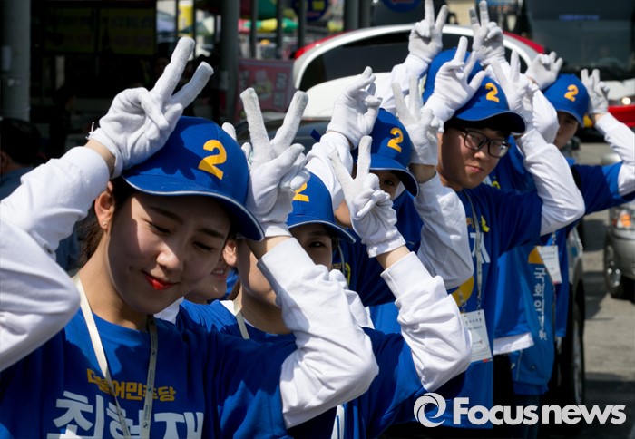 (전주=포커스뉴스) 1일 오전 전북 전주 모래내시장 입구에서 열린 더불어민주당 최형재 전주을, 김성주 전주병 후보 유세에 참여한 선거운동원들이 지지를 호소하고 있다.