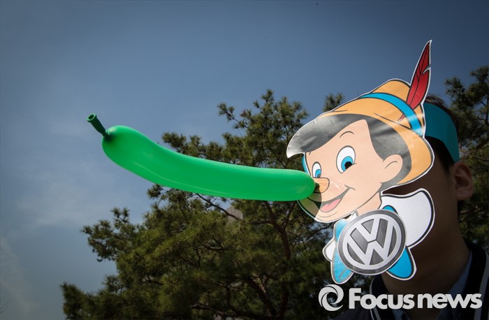 (서울=포커스뉴스) 1일 오전 서울 서초구 서울중앙지법에서 피노키오 탈을 쓴 서민민생대책위원회, 서울환경연합 회원들이 '아우디ㆍ폭스바겐 규탄 및 피해보상 촉구' 기자회견을 열고 있다.