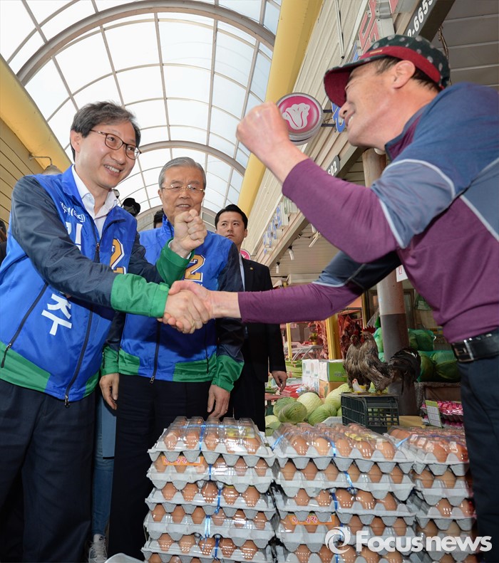 (전주=포커스뉴스) 1일 오전 전북 전주 모래내시장을 방문한 김종인(가운데) 더불어민주당 비대위 대표 겸 선대위원장과 김성주 전주병 후보가 상인들과 인사하며 지지를 호소하고 있다.