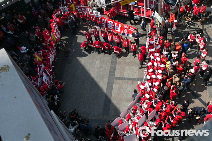 (수원=포커스뉴스) 1일 오전 경기도 수원시 팔달구 수원역 로데오거리 입구에서 새누리당 수원지역 후보자 합동 유세가 열리고 있다.