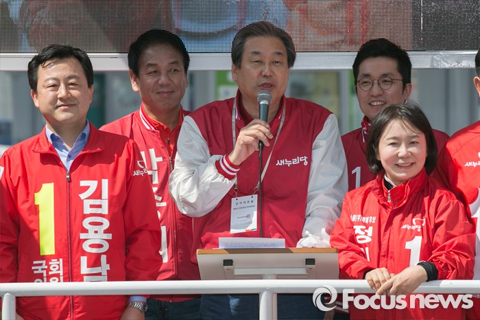 (수원=포커스뉴스) 김무성(가운데) 새누리당 대표가 1일 오전 경기도 수원시 팔달구 수원역 로데오거리 입구에서 열린 새누리당 수원지역 후보자 합동 유세에 참석해, 지지를 호소하고 있다.
