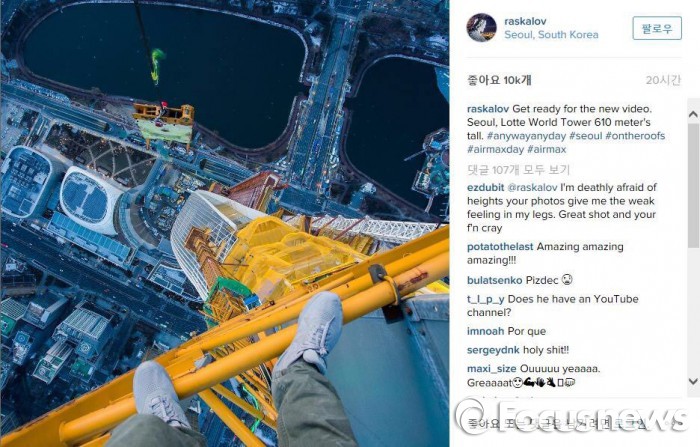 우크라이나 사진작가인 비탈리 라스칼로프는 지난 26일 자신의 인스타그램과 유튜브 등 SNS에 롯데월드타워 꼭대기에서 찍은 사진을 공개했다. 공사용 대형 크레인 위에 아슬아슬하게 올라가 아래를 내려다보는 구도다.