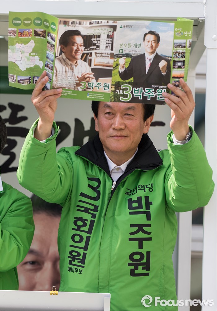 (안산=포커스뉴스) 박주원 국민의당 상록구갑 후보가 1일 오후 안산시 상록구 상록수역 월드프라자 앞에서 선거 유세를 하고 있다.