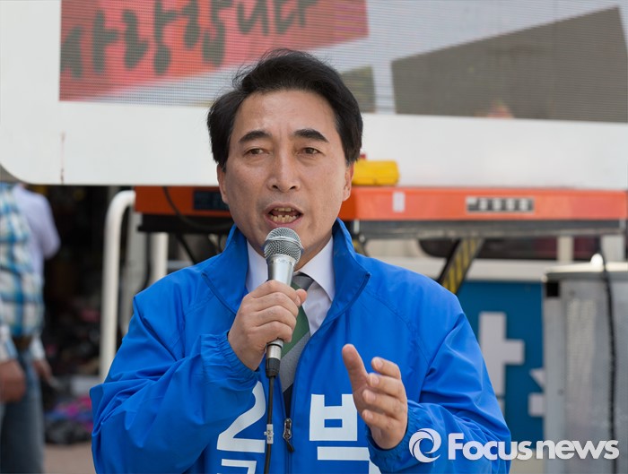 (공주=포커스뉴스) 1일 충남 공주시 산성시장 일원에서 박수현 더불어민주당 후보가 지지를 호소하고 있다.