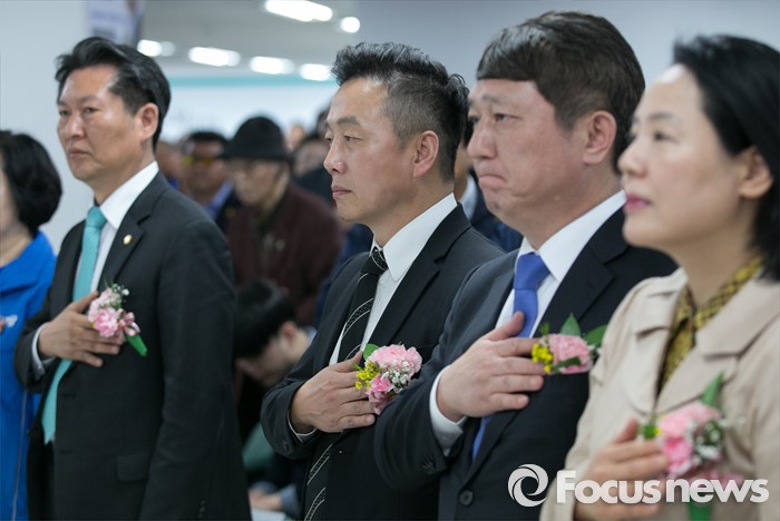 (익산=포커스뉴스) 더불어민주당 인사들이 1일 오후 한병도 전북 익산을 후보 선거사무소에서 열린 개소식에 참석해 국기에 대한 경례를 하고 있다. 오른쪽부터 임수경, 최재성 의원, 정봉주 전 의원, 정청래 의원.
