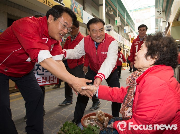 (공주=포커스뉴스) 1일 충남 공주시 산성시장 일원에서 강창희 전 국회의장이 시민들에게 정진석 새누리당 후보를 지지해줄 것을 호소하고 있다.