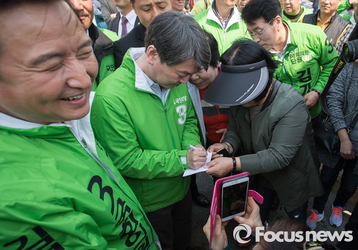 (안산=포커스뉴스) 안철수 국민의당 상임공동대표가 1일 오후 안산시 상록구 상록수역 월드프라자 앞에서 김영환 상록구을 후보(왼쪽 첫번째)와 박주원 상록구갑 후보 지원 유세를 하던 중 한 지지자에게 사인을 해주고 있다.