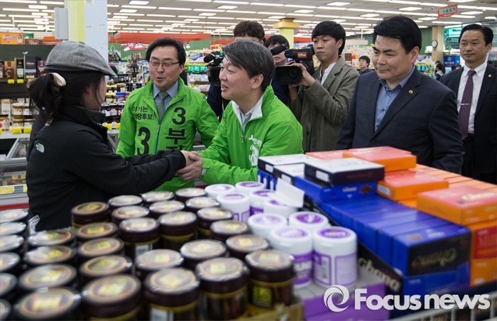 (안산=포커스뉴스) 안철수 국민의당 상임공동대표가 1일 오전 안산시 단원구 초지동에서 부좌현 단원구을 후보 지원 유세를 하고 있다.