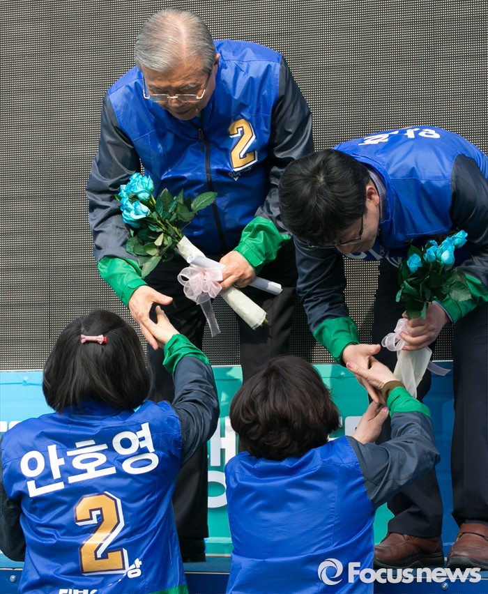 (완주=포커스뉴스) 1일 오후 전북 완주군 둔산공원 앞 사거리에서 김종인(왼쪽) 더불어민주당 비대위 대표 겸 선대위원장과 안호영 완주·진안·무주·장수군 후보가 지지자들로부터 꽃을 전달받고 있다.
