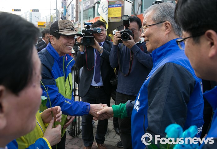 (완주=포커스뉴스) 1일 오후 전북 완주군 둔산공원 앞 사거리에서 김종인(오른쪽) 더불어민주당 비대위 대표가 안호영 완주·진안·무주·장수군 후보 유세를 마친 뒤 시민 및 지지자들과 인사하고 있다.