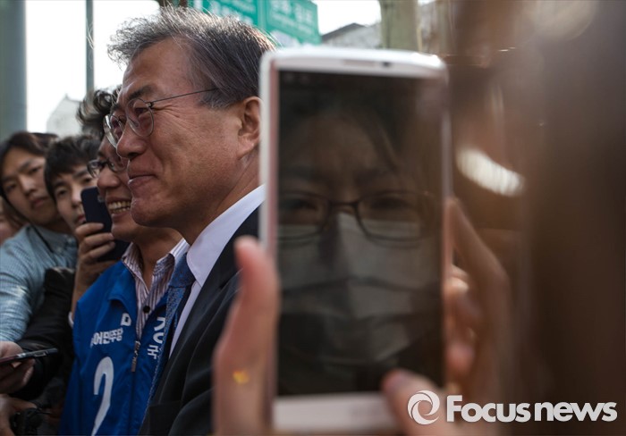 (서울=포커스뉴스) 1일 오후 문재인 전 더불어민주당 대표가 서울 강서구 방신재래시장에서 진성준 강서을 후보와 함께 유세를 하고 있다.
