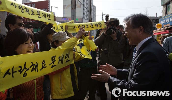 (서울=포커스뉴스) 1일 오후 문재인 전 더불어민주당 대표가 서울 강서구 방신재래시장에서 진성준 강서을 후보와 함께 유세를 하고 있다.