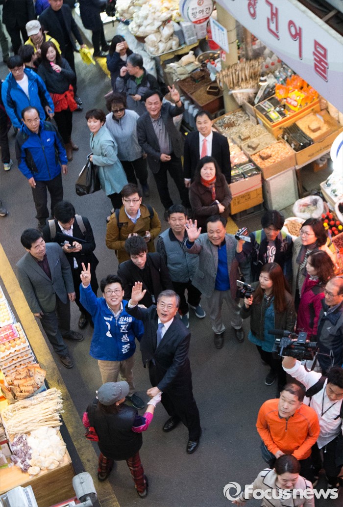(서울=포커스뉴스) 1일 오후 문재인 전 더불어민주당 대표가 서울 강서구 방신재래시장에서 진성준 강서을 후보와 함께 유세를 하고 있다.
