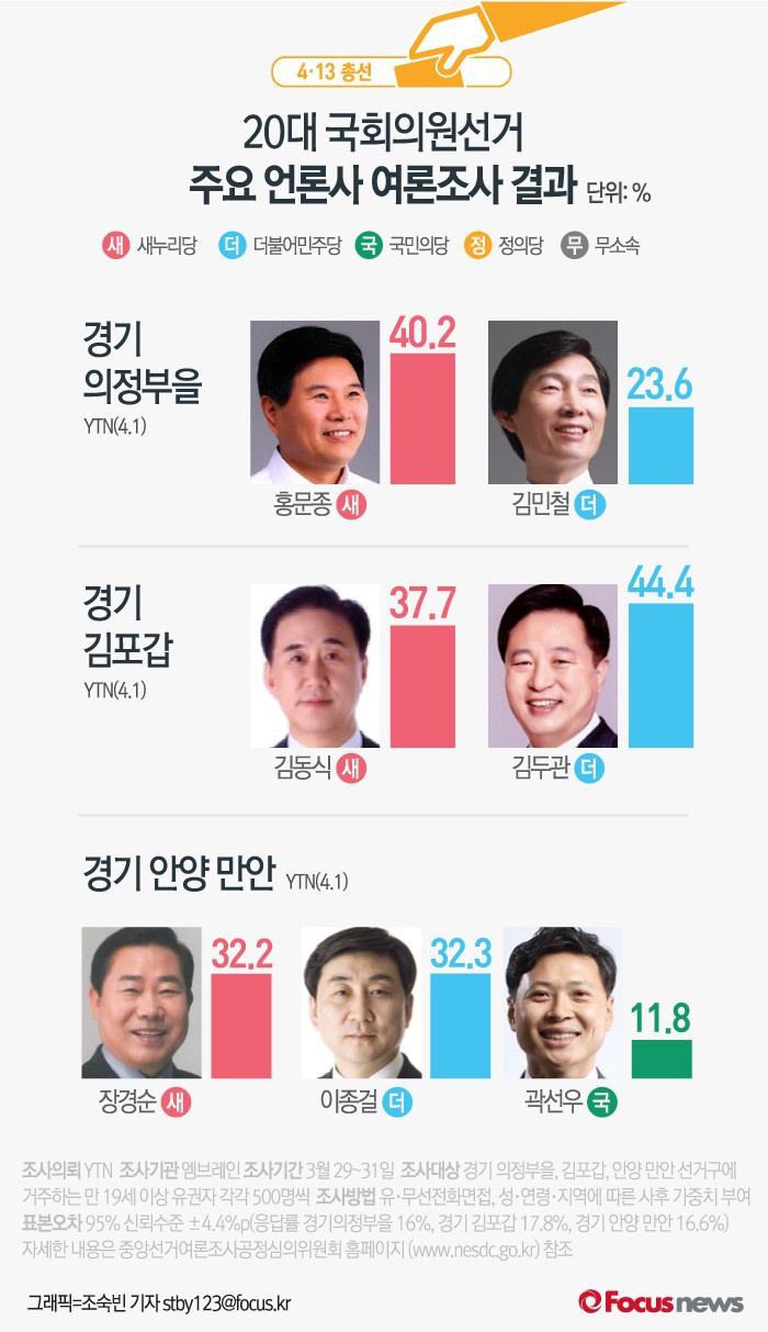 (서울=포커스뉴스) YTN이 엠브레인에 의뢰해 3월 29~31일 경기 의정부을, 김포감, 안양 만안 선거구에 거주하는 유권자 각각 500명씩에게 여론조사를 실시한 결과, 경기 안양 만안에서 새누리당 장경순 후보와 더민주 이종걸 후보의 지지율이 각각 32.3%, 32.3%로 나와 초박빙의 선거지역으로 떠올랐다.