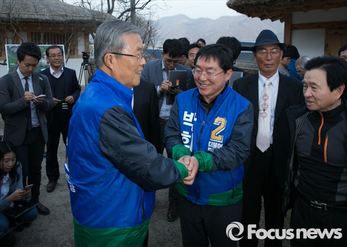 (순창=포커스뉴스) 김종인(왼쪽) 더불어민주당 비대위 대표 겸 선대위원장이 1일 오후 전북 순창군 가인 김병로 선생 생가를 방문해 박희승(오른쪽) 남원·임실·순창 후보의 건승을 기원하며 악수하고 있다.
