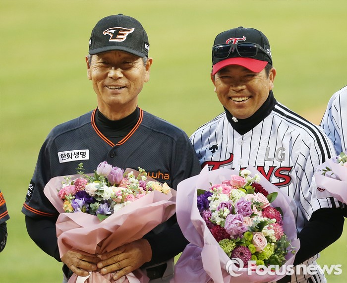 (서울=포커스뉴스) 1일 서울 잠실구장에서 열린 2016프로야구 개막전 한화-LG 경기에 앞서 가진 개막식에서 김성근 한화 감독(왼쪽)과 양상문 LG 감독이 활짝 웃으며 기념사진을 찍고 있다.