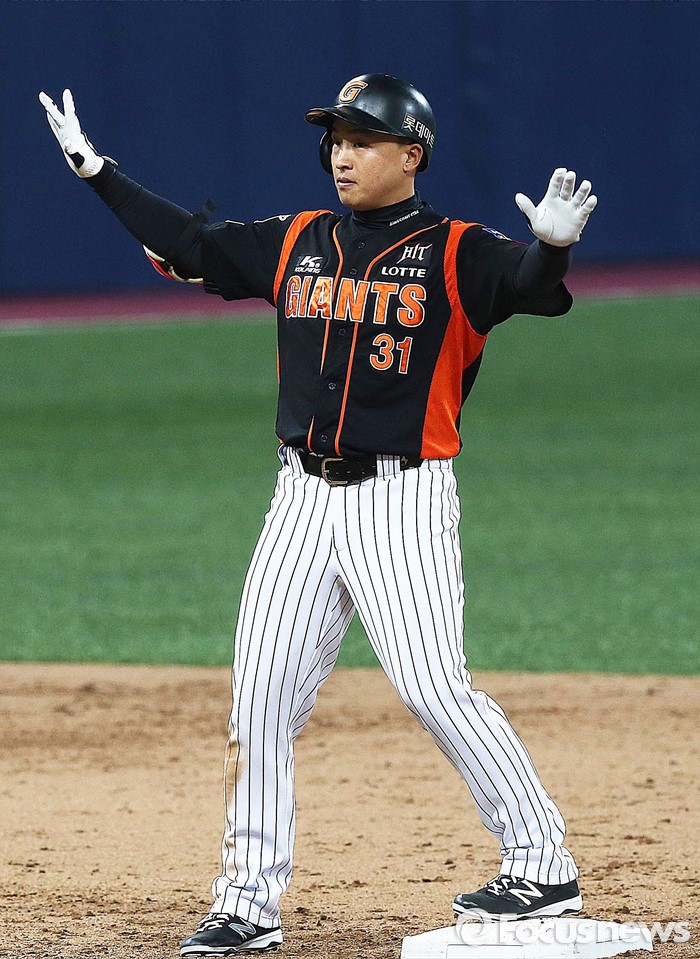 (서울=포커스뉴스) 1일 오후 서울 구로구 고척스카이돔에서 열린 2016 타이어뱅크 프로야구 개막전 넥센 히어로즈와 롯데 자이언츠의 경기 5회초 무사 상황 롯데 손아섭이 2루타를 성공시킨 뒤 손을 들고 있다.
