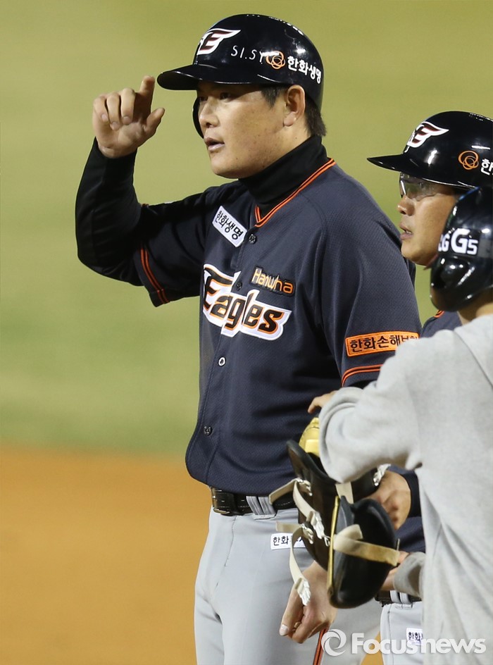 (서울=포커스뉴스) 1일 서울 잠실구장에서 열린 2016프로야구 개막전 한화-LG 경기 9회초 1사 1루에서 한화 이성열이 우익수 앞 안타를 치고 1루에서 덕아웃을 보고 있다. 이성열은 4타수 4안타를 쳤다.